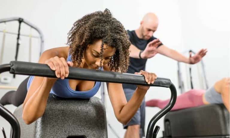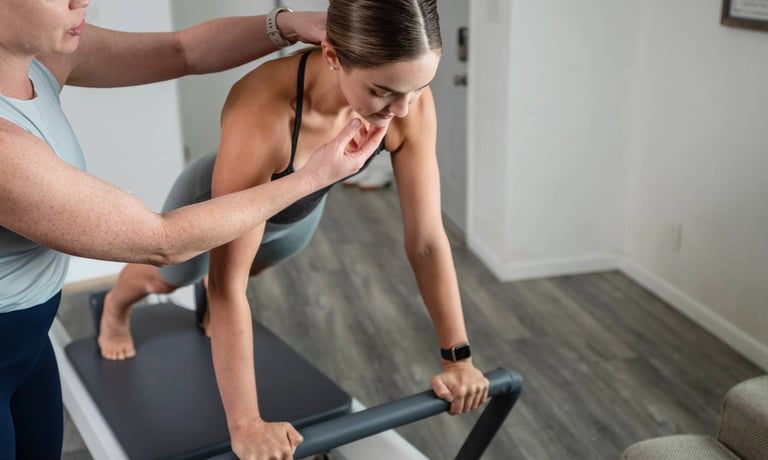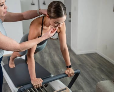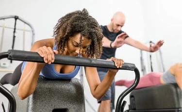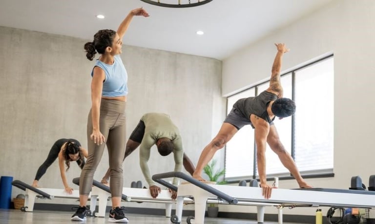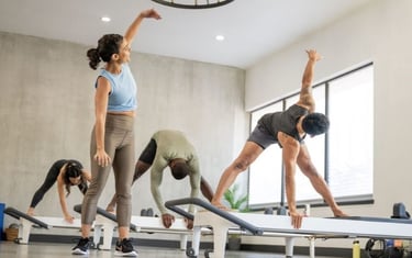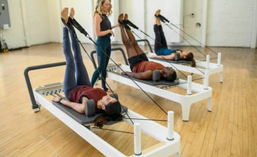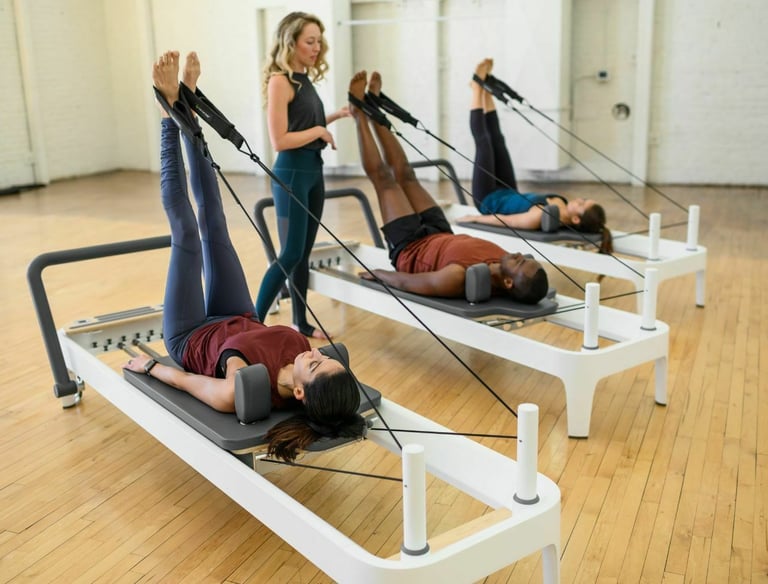 Oefeningen vloeien soepel in elkaar over op de reformer. Je bouwt verder op de basis met meer tempo en uitdaging.